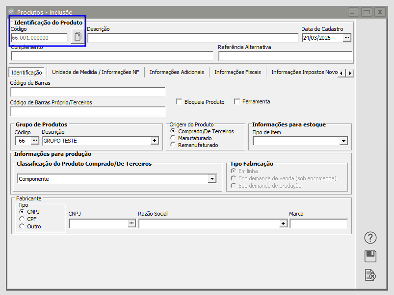 Logo, ao abrir a tela para fazer um cadastro de produto (Manutenção → Produtos → Cadastra), o código numérico deste, se baseará na regra acima e não na geração automática de código de produto caso o parâmetro estivesse selecionado. Assim sendo, na caixa de 'Identificação do Produto', pode-se conferir que o 'Código' foi gerado corretamente, seguindo os números inicias que foram colocados na etapa anterior e complementados seguido a regra do sistema.