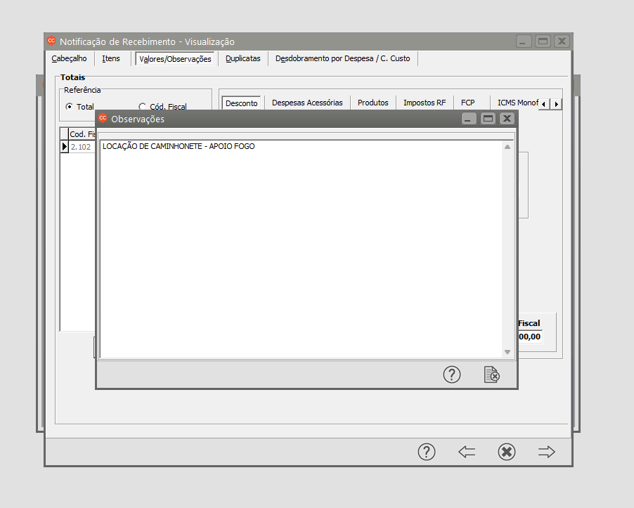Movimentação > Notificações de Recebimento > Valores/Observações > Observações
