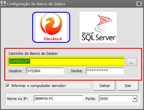 • No caminho do Banco de Dados colocar “SUPERSOFT” e Salvar.