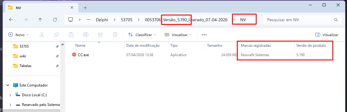 No exemplo do módulo de Compras, uma pasta "SS" e outra pasta "NV" e o arquivo "Altver" referente ao módulo também deverá ser incluído nesta pasta, com o padrão "Altver+módulo (neste exemplo, AltverCC)":
