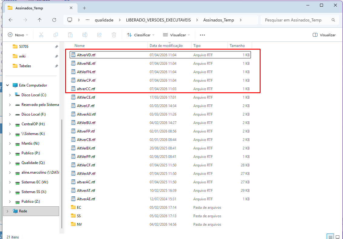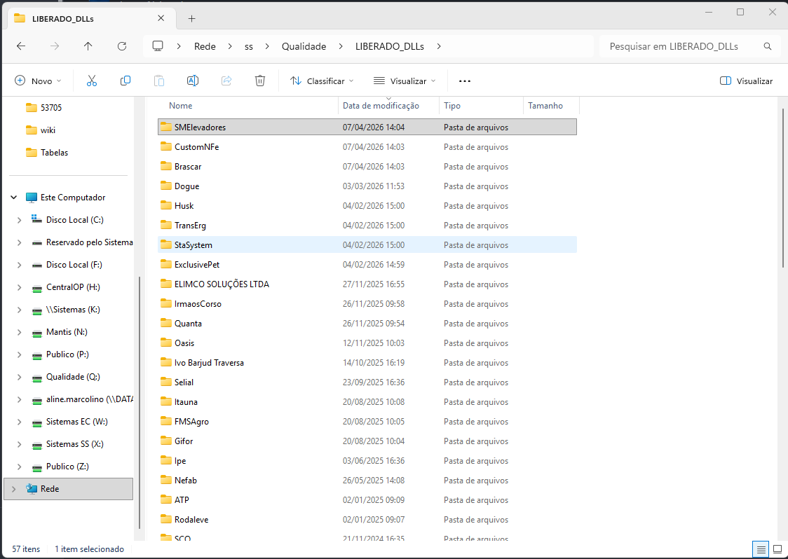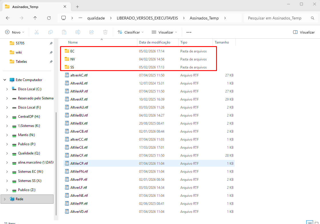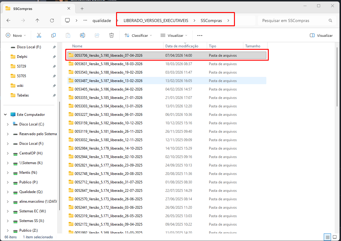 Após os passos acima serem realizados, copiar a pasta de cada um dos módulos que foram criadas, acessar o caminho "\\ss\qualidade\LIBERADO_VERSOES_EXECUTAVEIS" e colá-las dentro das pastas dos respectivos módulos: