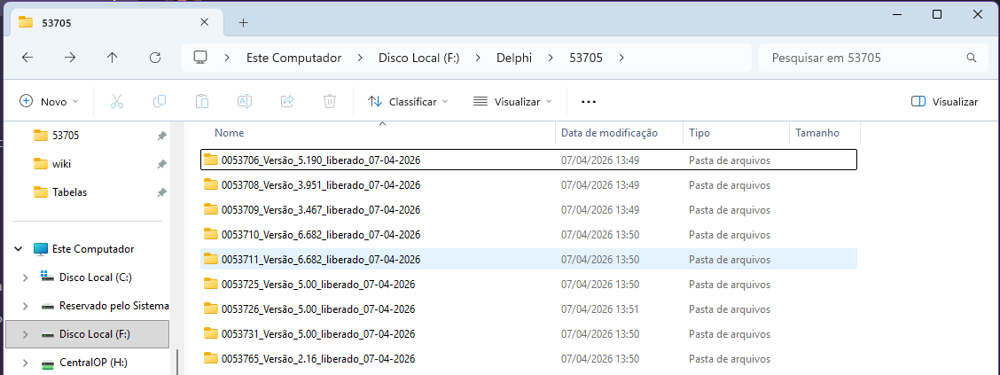 Primeiramente deverá ser criada uma pasta para cada módulo que será liberado, seguindo o padrão "Número do caso pai_Versão_Número da Versão_liberado_data da liberação", conforme exemplo: "0053706_Versão_5.190_liberado_07-04-2026". Dentro dessa pasta deverão ser criadas uma pasta para cada ambiente que será liberado: