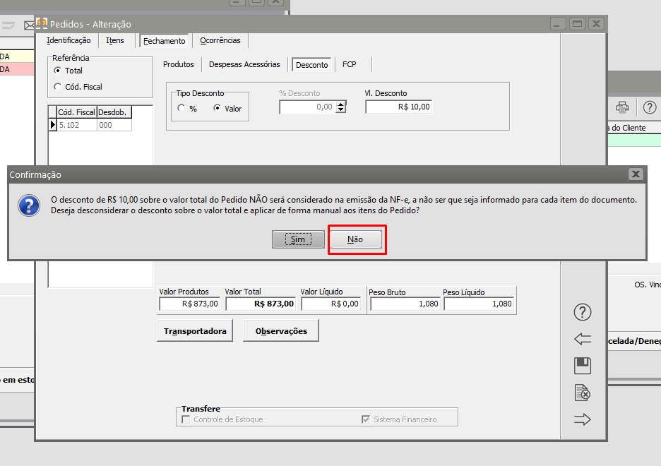 Ao definir o desconto total, aparecerá uma mensagem de confirmação para ratear o desconto sobre o valor total aos itens do Pedido, assim, clicar em "Não":