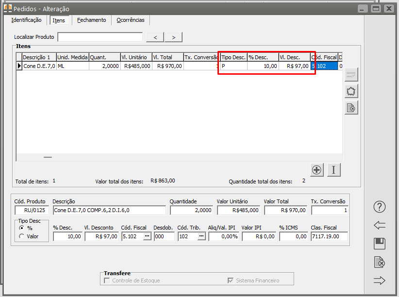 Definido desconto nos itens:
