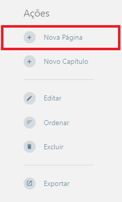 Para criar uma página, acesse o livro ou o capítulo onde deseja criar e no menu de ações, no canto superior direito clique na opção "Nova página".