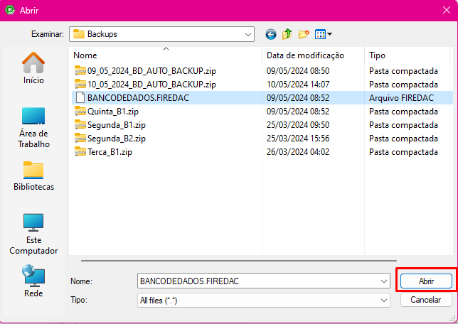 No campo "file name", clique nos três pontinhos para informar o caminho que esta o backup FIREDAC