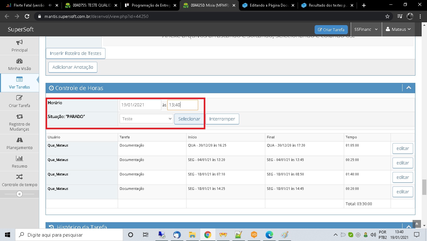 Verificar que ao clicar em "Selecionar" será adicionado um registro de apontamento de hora no Mantis, com o tipo de tarefa selecionado, neste exemplo, "Teste" e com a data e início da atividade. A coluna "Tempo" será exibida como "em andamento" até que o teste seja finalizado: